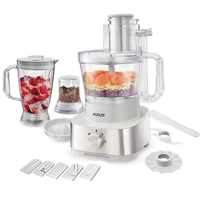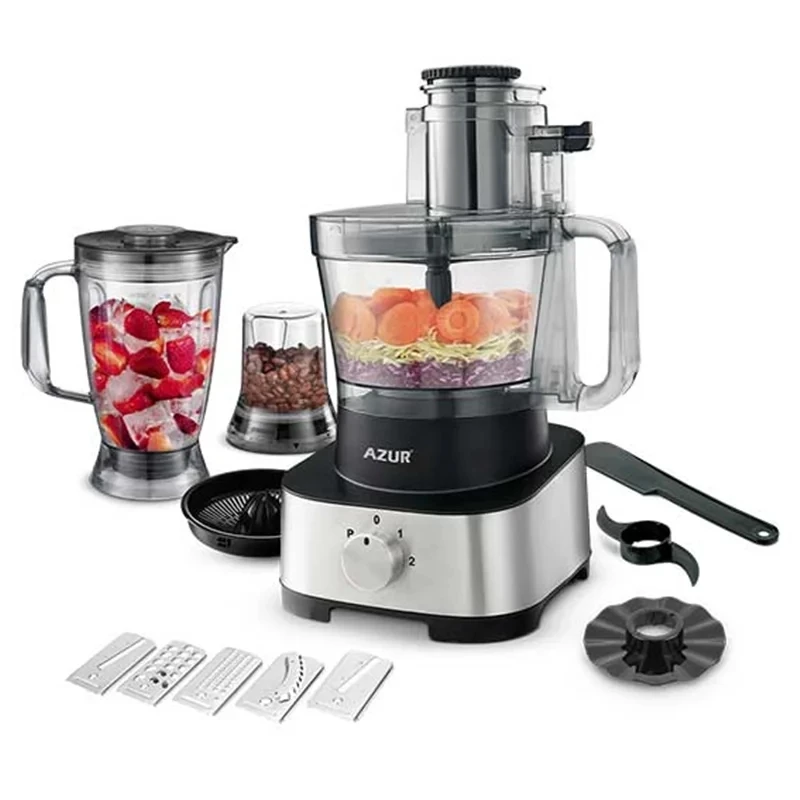 غذاساز آزور مدل AZ-271FP با توان 1000 وات با تنظیم قدرت دو حالته و قابلیت های غذاساز ، خرد کن ، آسیاب ،آب مرکبات گیری و خمیر زن ... این مدل غذاساز از 5 رنده مختلف برخوردار است و راحتی در آشپزی را برای شما به ارمغان خواهد آورد