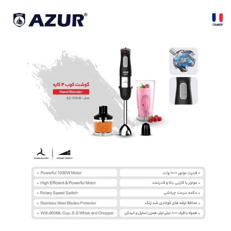 گوشت کوب ۴ کاره آزور موتور ۱۰۰۰ وات دکمه سرعت بخشی محافظ تیغه های فولادی ضد زنگ همراه با ظرف ۸۰۰ میلی لیتر،همزن استیل و خرد کن طول کابل ۹۰ تیغه دو پره